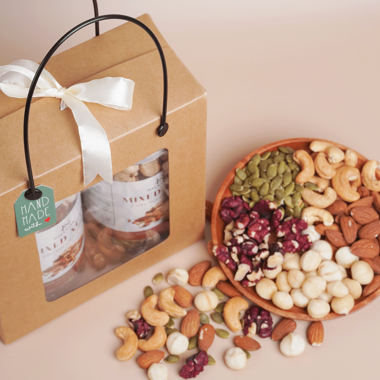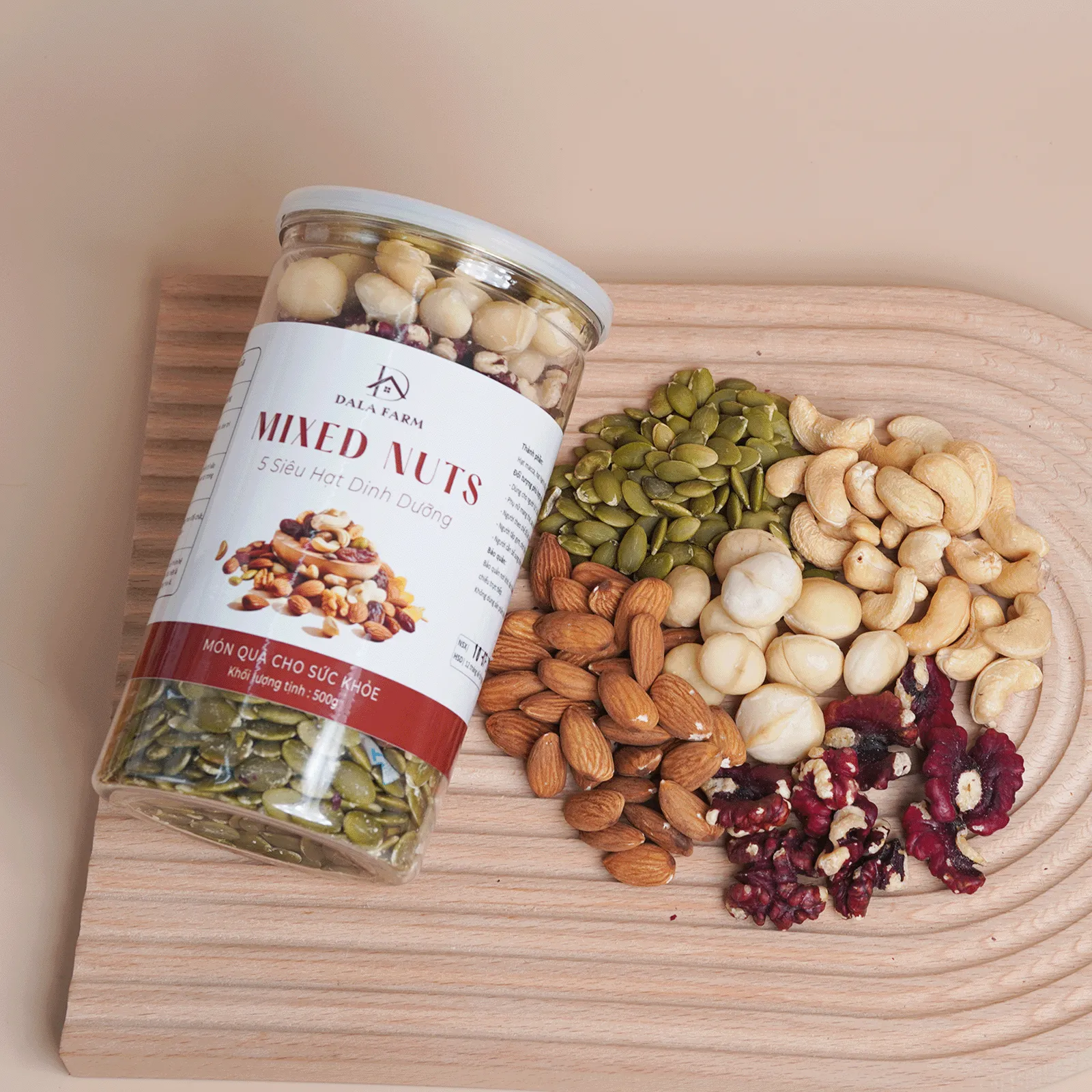 - Thành phần: Nhân macca, Nhân óc chó đỏ, Hạnh nhân, Bí xanh, Hạt điều.